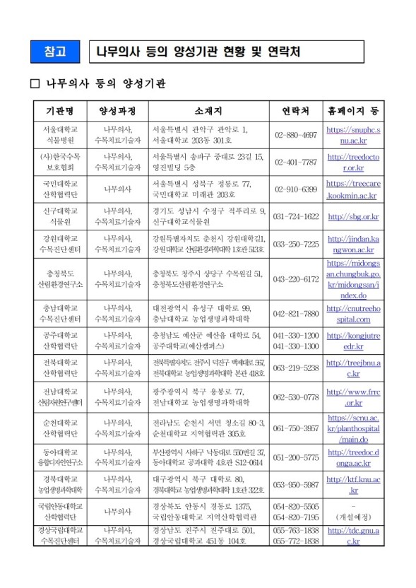 나무의사 양성기관은 15개소로 서울대학교 식물병원, (사)한국수목보호협회, 국민대학교 산학협력단, 신구대학교 식물원, 강원대학교 수목진단센터, 충청북도 산림환경연구소, 충남대학교 산학협력단, 공주대학교 산학협력단, 전북대학교 산학협력단, 전남대학교 산림자원연구센터, 순천대학교 산학협력단, 동아대학교 융합디자인연구소, 경북대학교 농업생명과학대학, 안동대학교 산학협력단, 경상대학교 수목진단센터이다. 기관별로 나무의사 양성교육이 연 2회 정도 실시하니 희망하는 교육기관 홈페이지를 참고하여 일정에 맞추어 신청하세요.