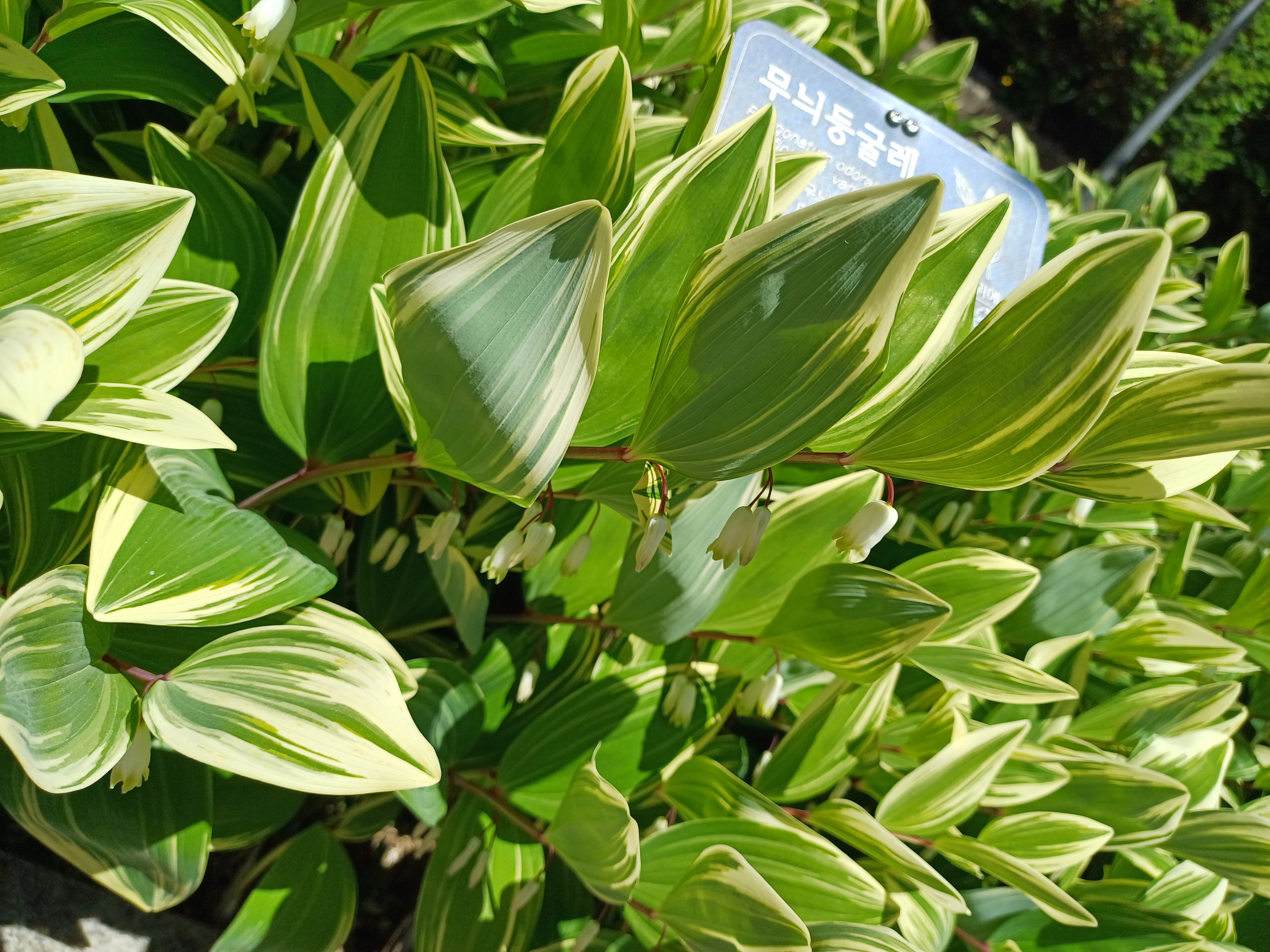 무늬둥글레는 백합과에 속하는 다년생 초본식물로, 학명은 Polygonatum odoratum var. pluriflorum for. variegatum이라 한다. 일반 둥글레와 달리 잎에 흰색 또는 황색의 줄무늬가 있어 관상적 가치가 뛰어나며, 실내외 정원용으로 널리 활용된다. 줄기는 곧게 서며, 뿌리는 지하경 형태로 옆으로 뻗어가며 번식한다. 5월경에 백록색의 종모양 꽃이 줄기 아래쪽에 달리며, 은은한 향이 있어 시각적 미와 후각적 즐거움을 동시에 제공한다. 무늬둥글레는 한방에서 둥글레차의 재료로 쓰이는 일반 둥글레와 달리 약용보다는 관상용으로 더욱 적합하다.