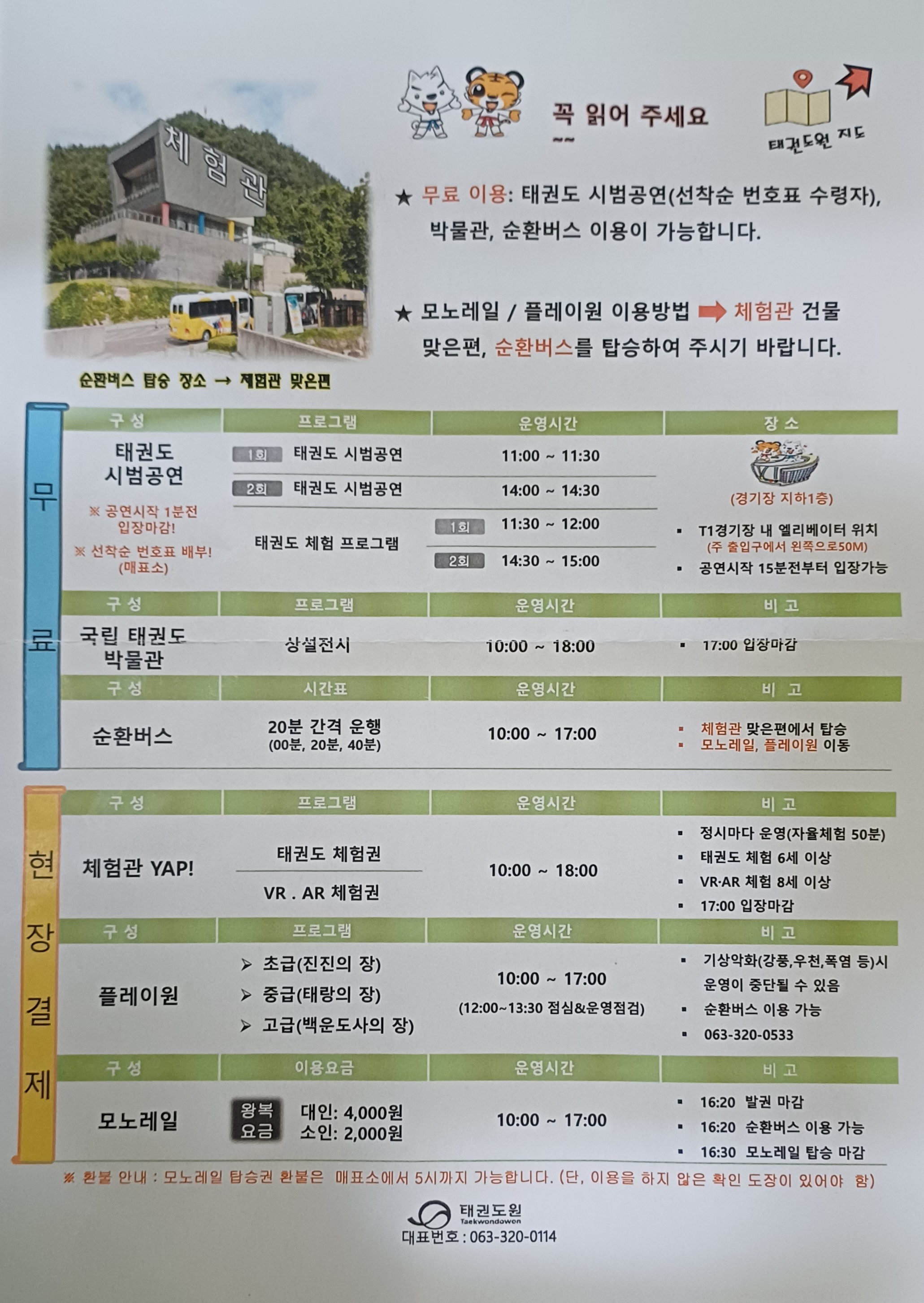 운영 시간은 10:00~18:00이며, 입장 자체는 무료입니다. 단, 체험 프로그램은 유료이며, 태권도 체험권(6,000원), VR·AR 체험권(6,000원), 통합권(10,000원)이 있습니다. 모노레일도 운영되며, 성인은 4,000원, 소인·청소년은 2,000원입니다. 태권도 시범공연은 하루 2회(11:00, 14:00) T1 경기장 지하1층에서 선착순 입장(공연 시작 15분 전부터 입장 가능)으로 관람 가능하며, 같은 장소에서 태권도 체험 프로그램도 1일 2회(11:30, 14:30) 운영됩니다. 박물관은 상설전시로 오전 10시부터 오후 6시까지 무료 관람이 가능하며, 순환버스는 20분 간격으로 10시부터 17시까지 운행합니다. 체험관 YAP!에서는 초등학생 이상을 대상으로 태권도 및 VR·AR 체험권 프로그램을 오전 10시부터 오후 6시까지 운영하고, 플레이원에서는 초급(진진의 장), 중급(태랑의 장), 고급(백운도사의 장) 세 가지 난이도의 수련 프로그램이 오전 10시부터 오후 5시까지 진행되며 기상 조건에 따라 변동될 수 있습니다. 모노레일은 오전 10시부터 오후 5시까지 운행되며, 마지막 발권은 16:20입니다. 모든 유료 프로그램은 체험관 맞은편 매표소에서 발권하며, 플레이원과 모노레일은 순환버스를 타고 이동해야 합니다.