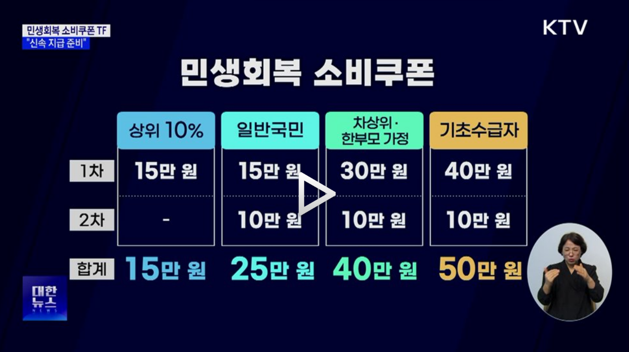 - TF 구성: 행정안전부, 기획재정부, 보건복지부 등 관계부처가 참여하는 범정부 태스크포스(TF)가 세부 지급방안, 신청·지급 방법, 사용처 등을 논의하고 있습니다.