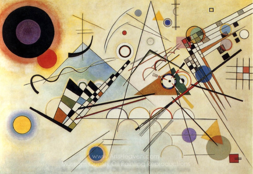 바실리 칸딘스키의 1923년작 <구성 VIII>는 형태들의 장엄한 결합을 통해 20세기 초 모더니즘의 높은 이상을 서사적으로 표현한 작품이다. 이 작품에서 칸딘스키는 음악과 움직임을 핵심 요소로 삼았으며, 이는 초기의 스타일적 특징에서 벗어나 모더니즘 회화의 가장 독창적이고 인지 가능한 작품 중 하나로 자리 잡게 된다. 초기에는 추상적 풍경화를 그렸지만, 제1차 세계대전을 전후로 그는 형상적인 표현을 완전히 배제하고 창작 과정에서 보다 자유로운 접근 방식을 개발하기 시작했다. 1909년 칸딘스키는 첫 번째 <즉흥>(Improvisation) 시리즈를 제작했으며, 이듬해에는 비슷한 개념적 방식으로 첫 번째 <구성>(Composition) 시리즈를 시작했다.