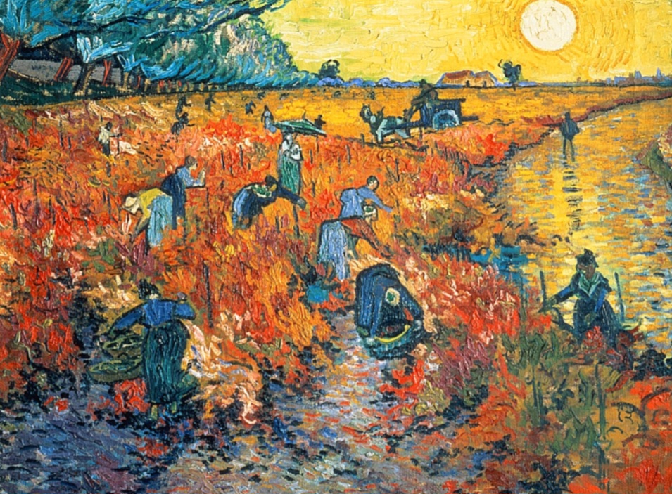 <붉은 포도밭>은 고흐가 프랑스 남부 아를에서 활동하던 시기에 제작된 작품으로, 그가 생전에 판매한 유일한 작품이다. 이 작품은 벨기에 브뤼셀에서 열린 "20인의 전시회"에서 400프랑(약 2천 달러 상당)으로 판매되었으며, 벨기에 화가이자 예술 후원자인 안나 보흐(Anna Boch)가 구입했다. 그녀는 인상주의 화가이자 고흐의 동생 테오 반 고흐와 교류가 깊었던 외젠 보흐(Eugène Boch)의 누이이기도 했다. 작품은 석양이 지는 붉은빛 포도밭에서 농부들이 포도를 수확하는 모습을 그린 것으로, 강렬한 색채와 역동적인 붓 터치가 특징이다. 노란빛이 감도는 하늘과 붉은색이 강조된 땅, 그리고 대비되는 색감 속에서 고흐 특유의 감각적인 색채 실험이 돋보인다. 자연의 아름다움과 노동의 가치를 조화롭게 표현한 이 작품은 그의 후기 인상주의 화풍을 대표하는 작품 중 하나로 평가된다.
