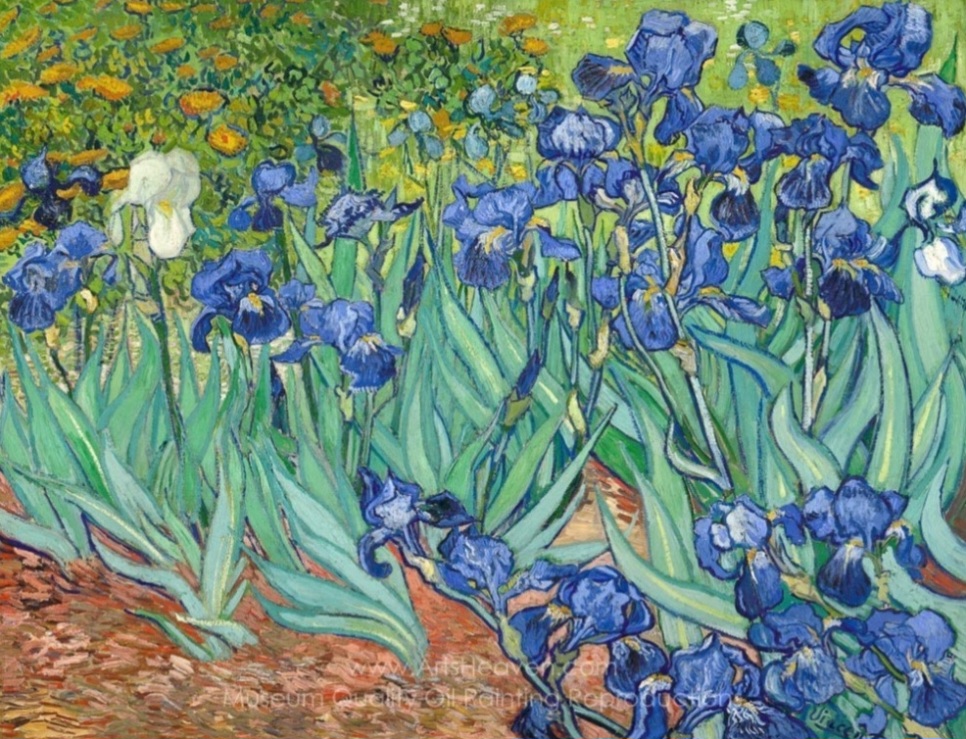 <아이리스>는 아이리스 꽃이 가득한 정원을 그린 작품으로, 전경의 짙은 파랑과 보라색 꽃, 배경의 금빛 꽃들이 어우러지며 풍부한 색감을 보여준다. 언뜻 보기에는 단순한 꽃 그림처럼 느껴지지만, 자세히 보면 명확한 빛의 방향이 없고, 색감과 구도가 기존 유럽 화풍과는 다르다는 점을 발견할 수 있다. 이는 반 고흐가 일본 판화에서 받은 영향을 반영한 결과로, 굵은 윤곽선과 평면적인 색채, 비정형적인 시점이 특징을 이룬다. 단순한 꽃 그림을 넘어 동양적 미감과 실험적 구성이 어우러지는 작품이라 할 수 있다.