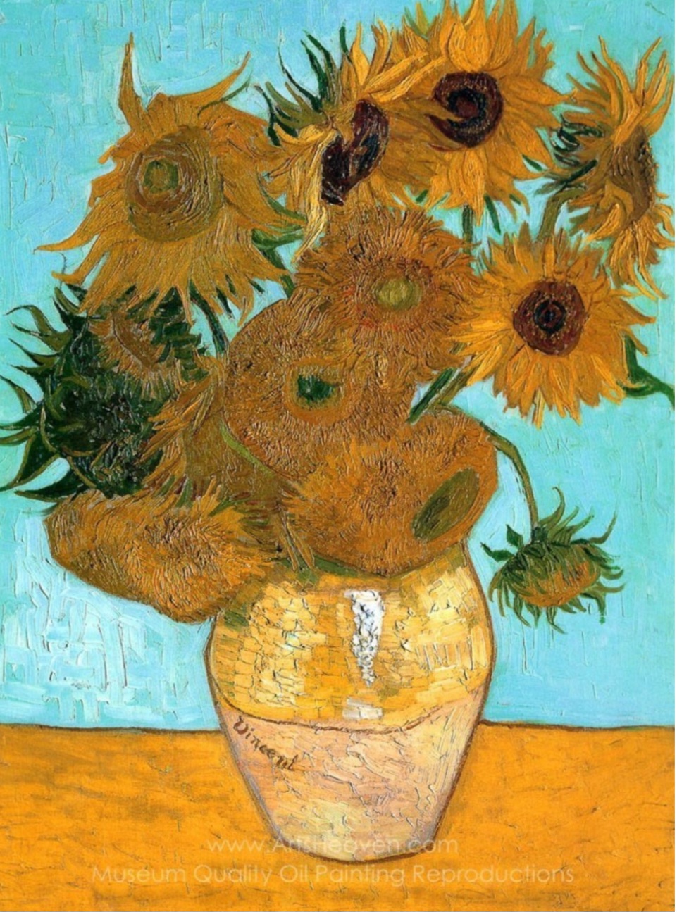 빈센트 반 고흐(1853~1890)는 네덜란드 출신의 후기 인상주의 화가로, 강렬한 색채와 감성적인 붓놀림을 통해 독창적인 예술 세계를 구축한 인물이다. 그는 생전에는 큰 주목을 받지 못했지만, 사후 그의 작품은 현대 미술사에서 가장 영향력 있는 작품으로 평가받고 있다. 특히, 그는 자연과 사물을 단순히 묘사하는 것이 아니라, 자신의 감정을 투영하여 재해석하는 화풍을 발전시켰다. 반 고흐의 그림은 선명한 색채와 역동적인 붓 터치가 특징이며, 이는 그의 감정 상태와 정신적 고통을 반영하는 요소이기도 하다. 그는 가난과 정신적 불안 속에서도 창작 활동을 멈추지 않았으며, 특히 생애 마지막 몇 년 동안 수많은 걸작을 탄생시켰다. 그중에서도 <열두 송이 해바라기가 담긴 화병(Vase with Twelve Sunflowers)>은 그의 대표작 중 하나로, 오늘날에도 많은 사람들에게 사랑받고 있다.