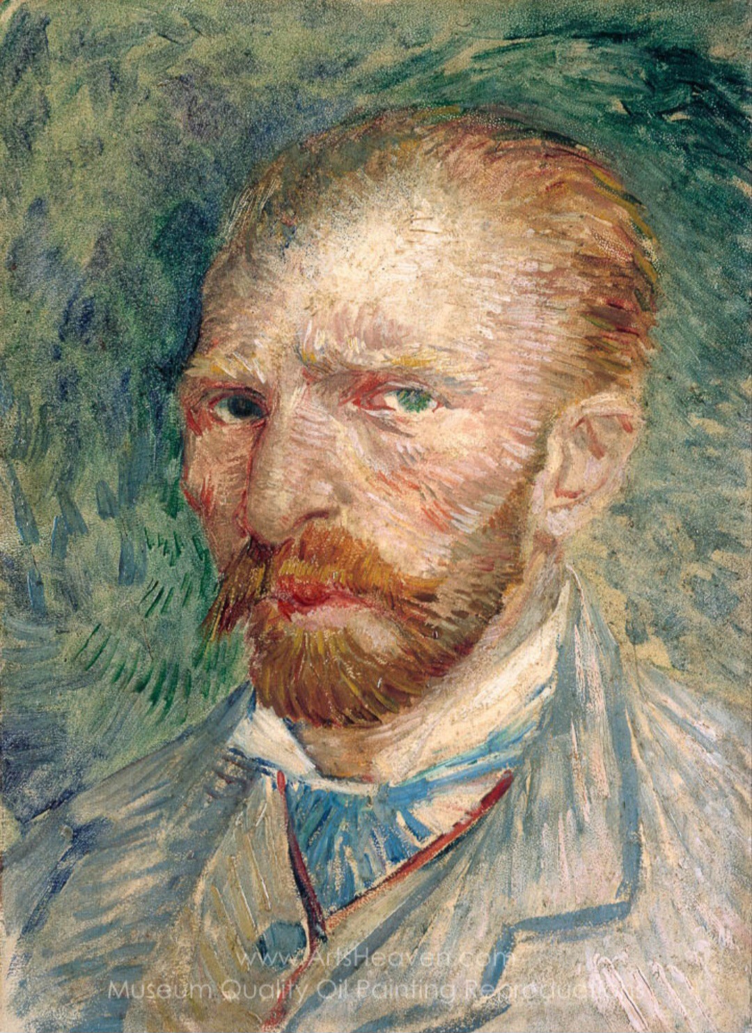 고흐가 1887년에 제작한 <자화상>은 그가 파리에 머물던 시기의 대표작으로, 화풍의 전환점을 보여준다. 이 시기는 고흐가 인상주의와 신인상주의 화가들과 교류하며 색채 사용과 붓질에 있어 큰 영향을 받은 시기이다. 1887년 <자화상>에서는 이전의 어두운 색조 대신 밝고 생동감 있는 색채가 도입되며, 배경과 얼굴에는 점묘주의적 요소도 보인다. 이 작품은 고흐가 현실을 사실적으로 묘사하는 데 그치지 않고, 감정과 내면을 시각적으로 표현하는 데 집중했음을 보여준다. 특히 붉은 수염과 푸른 눈, 움직이는 듯한 배경의 붓터치는 고흐가 화폭을 통해 감정을 풀어내는 방식의 전형으로 해석된다.