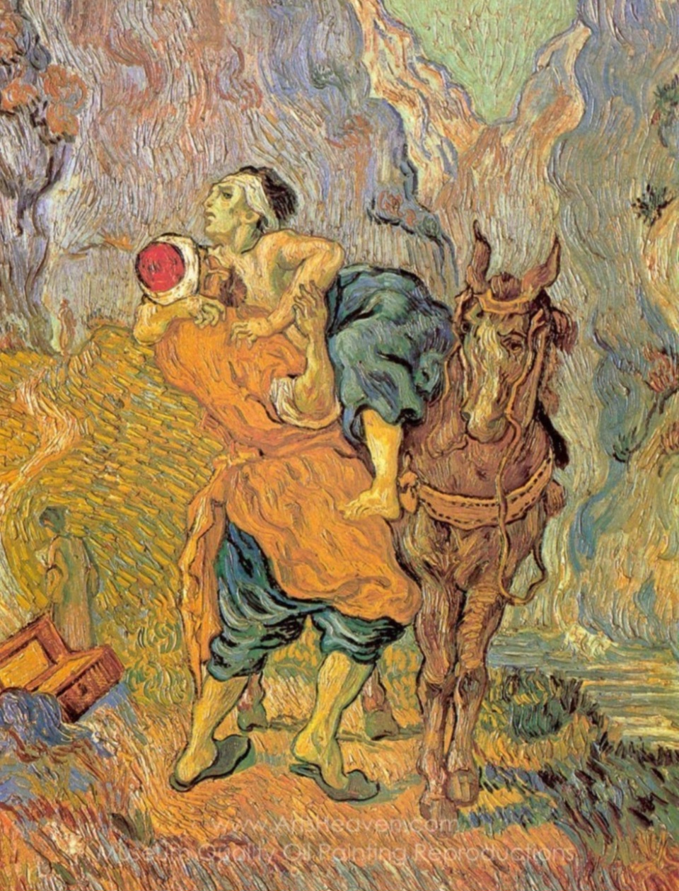 〈착한 사마리아인〉의 주제는 신약성경 누가복음 10장에 등장하는 예수의 비유에서 가져왔다. 한 유대인이 강도에게 습격당해 길가에 쓰러졌고, 제사장과 레위인은 그를 외면하며 지나간다. 그러나 유대인과 적대적 관계였던 사마리아인은 그를 불쌍히 여겨 상처를 치료하고 여관까지 데려가 보살핀다. 이 이야기를 통해 예수는 출신이나 신분이 아닌, 실제 행동을 통해 ‘이웃됨’을 실천해야 한다는 교훈을 전한다. 고흐는 이 비유 속 사마리아인을 연민과 사랑의 상징으로 바라보며, 고통받는 인간을 구원하는 행위에 깊은 공감을 표현하고자 했다.