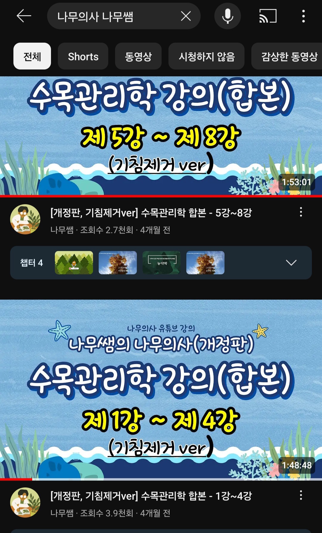 3. "유튜브 나무쌤 나무의사 필기" 의 수목관리학 강의(1강~22강)이다.