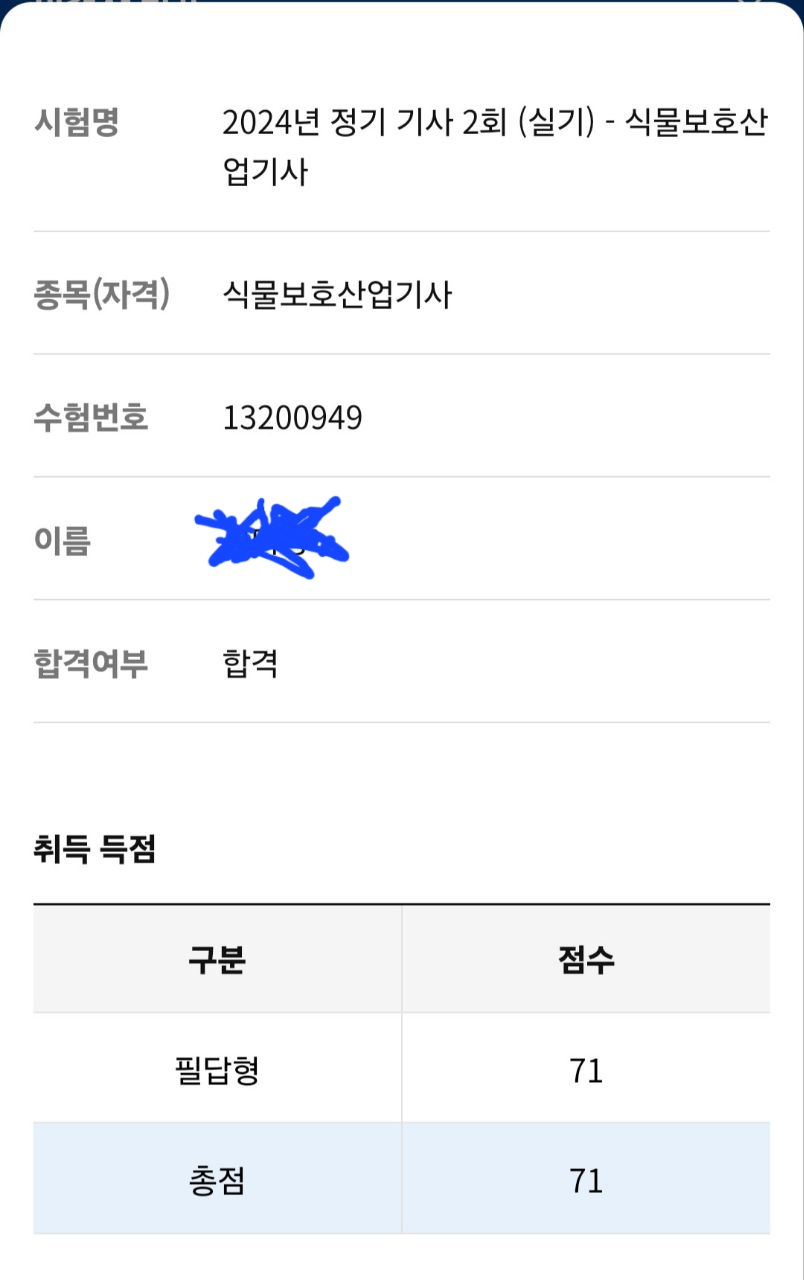 식물보호산업기사 실기시험을 71점으로 합격했다.