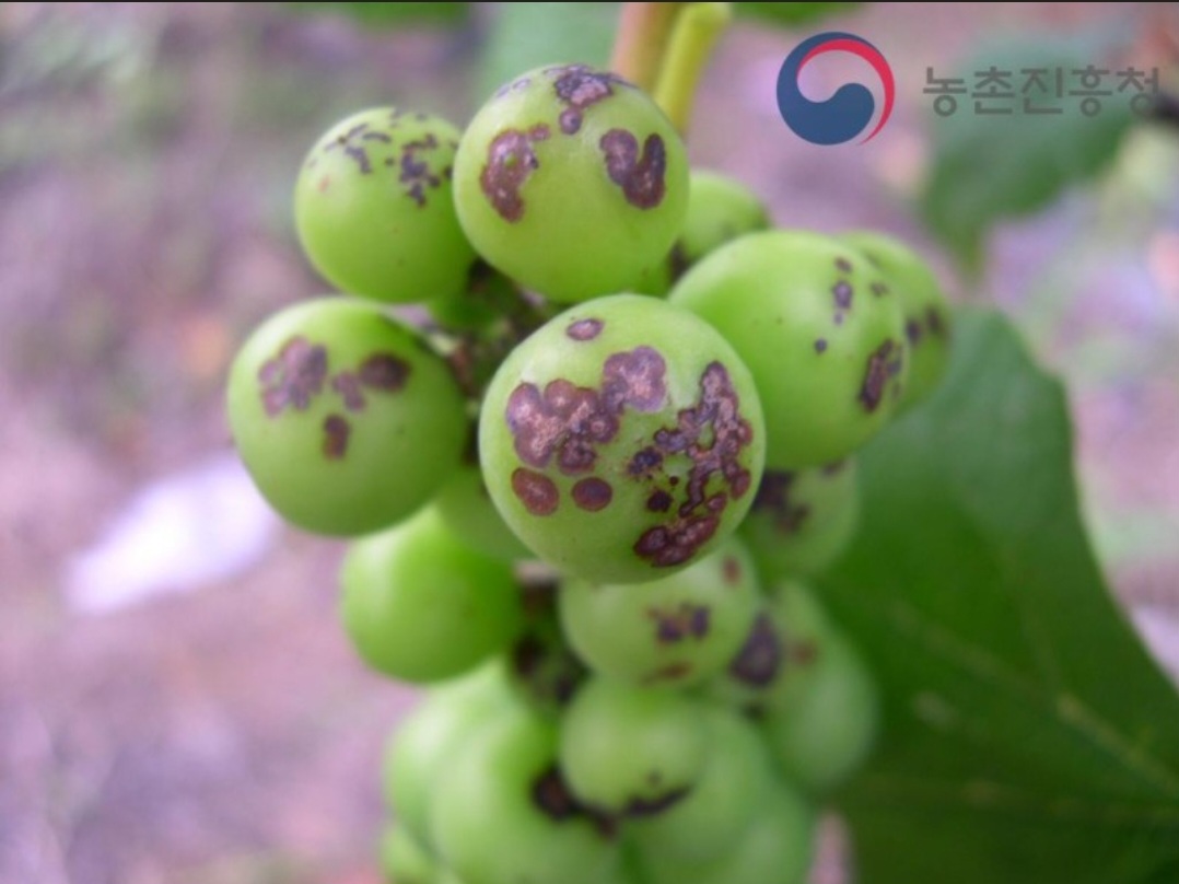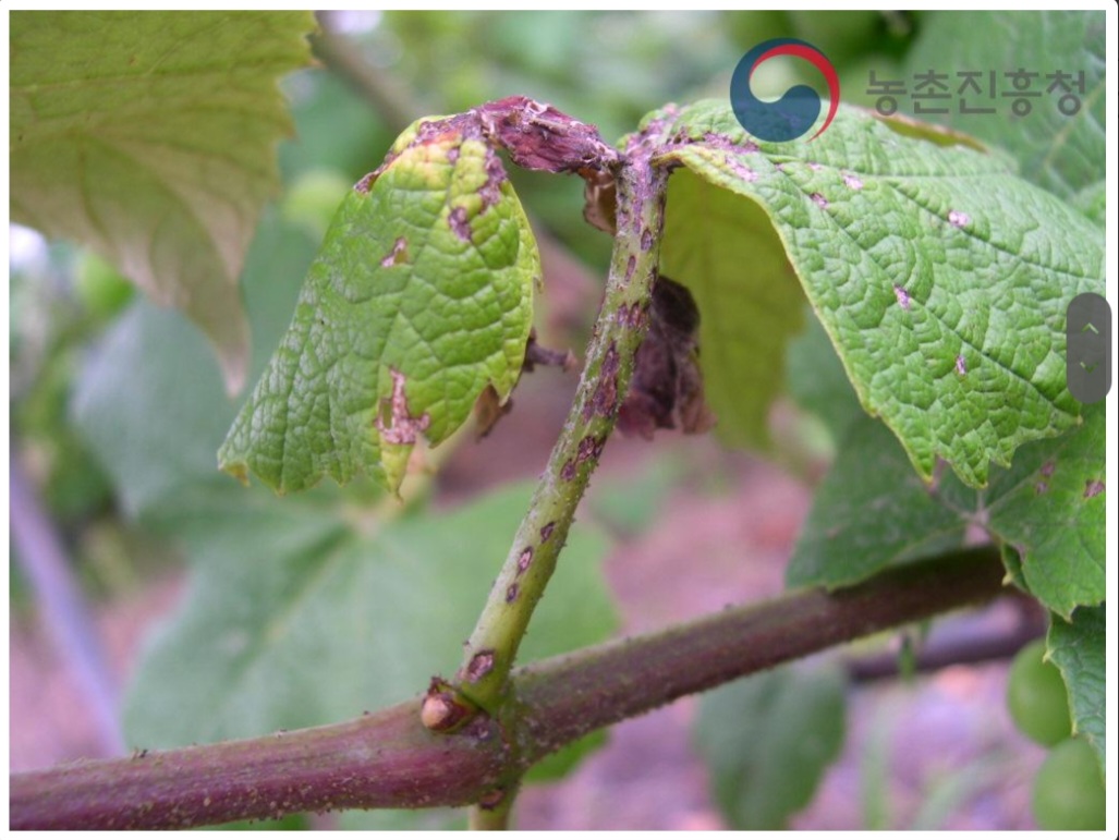 * 새눈무늬병: 기주가 포도이고 포도나무의 잎에 갈색의 작은 무늬가 생기며, 확산되어 결국은 잎이 노랗게 되고 낙엽이 됨