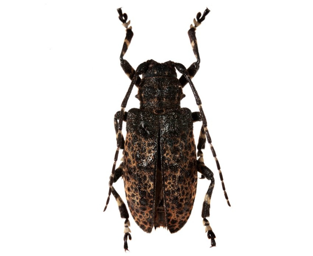[ 학명은 Moechotypa diphysis(Pascoe)이고 전체적으로 어두운 붉은색 바탕에 가슴과 딱지날개가 검은색 짧은 털로 불규칙하게 덮여있고 등이 울퉁불퉁하다. ]