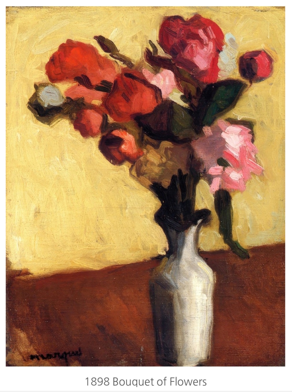 두 번째 작품인 〈Bouquet of Flowers〉(1898)는 앞선 작품보다 더 뚜렷한 색감과 간결한 형태가 돋보인다. 특히 붉은 계열의 꽃들이 화면을 지배하며, 노란 배경과의 대비를 통해 강렬한 인상을 준다. 꽃병과 테이블은 단순하게 처리되어 있어 꽃다발의 색채가 더욱 두드러진다. 이 작품은 색의 덩어리를 통한 구도 구성, 묘사보다 분위기를 중시한 표현 방식에서 마르케가 마티스 등 야수파 작가들과 함께 활동했던 초기 양식을 보여준다. 두 작품 모두 젊은 시절의 실험 정신과 향후 회화적 방향성을 잘 드러낸다.