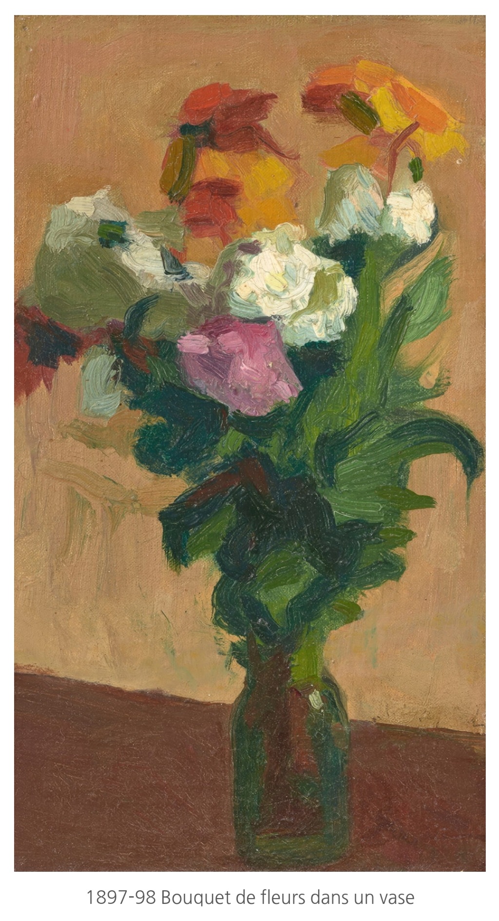 첫 번째 작품인 〈Bouquet de fleurs dans un vase〉(1897–98)는 투박한 유리병에 담긴 꽃다발을 그린 그림으로, 배경은 갈색과 담황색의 단색 처리로 깊이를 최소화하고, 주제인 꽃에 집중하도록 유도한다. 다양한 색의 꽃들이 붓터치 위주로 표현되어 있으며, 묘사보다 표현에 집중한 모습이 엿보인다. 꽃잎과 잎사귀는 세부적으로 묘사되기보다는 두텁고 거친 붓질로 다듬어졌으며, 이는 이후 마르케가 추구하게 되는 간결하고 감각적인 표현 방식의 전조로 볼 수 있다.