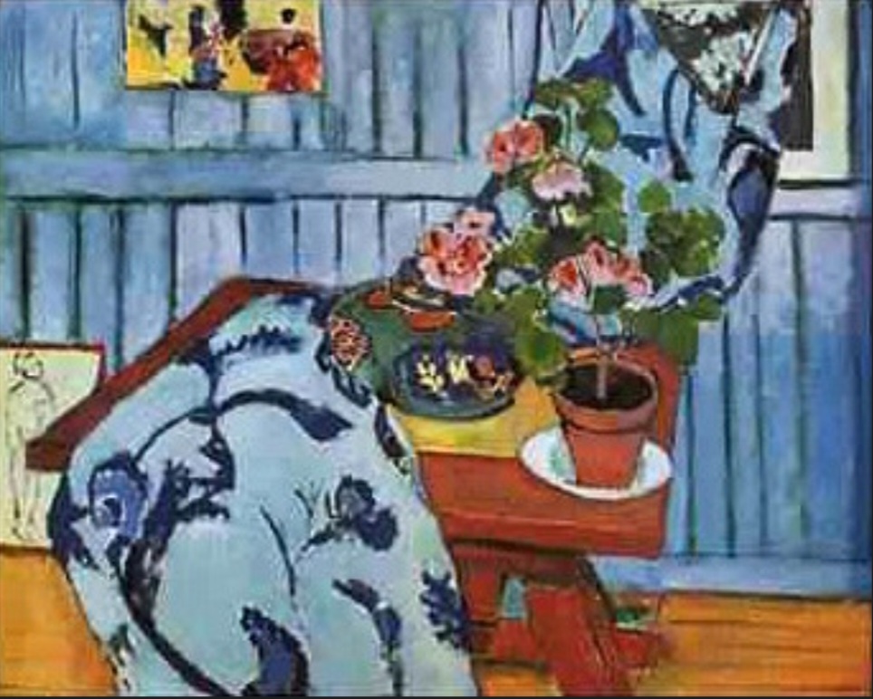 앙리 마티스의 <제라늄이 있는 정물화> 는 강렬한 색채와 대담한 붓질이 돋보이고, 붉은 제라늄 화분이 중심을 이루고 있다. 전통적인 원근법보다 색과 형태의 조화를 중시하고, 테이블 위의 다른 오브제도 감각적인 균형을 맞추기 위해 단순화하였다. 이 작품은 후기 인상주의와 야수파(Fauvism)의 영향을 받았으며, 색을 통한 감정 표현이 두드러진다.