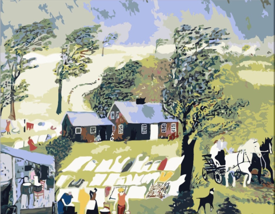 애나 메리 로버트슨 모지스(Grandma Moses)는 80세를 넘긴 나이에 본격적으로 그림을 시작해 미국 나이브 아트(Naïve Art)의 상징이 된 인물이다. 그녀의 대표작 중 하나인 <빨래 걷기(Laundry Day)>는 시골 생활의 소박하고 평화로운 풍경을 담은 작품으로, 고향의 정취와 가족의 일상을 아름답게 그려낸다. 이 작품에서는 바람에 나부끼는 빨래와 그 사이를 오가는 사람들의 모습, 주변의 초가집과 들판이 어우러져 따뜻한 공동체의 분위기를 전한다. 복잡한 원근법이나 사실적인 묘사는 피하고, 평면적 구도와 단순한 색감으로 순수한 시선을 표현하는 것이 이 작품의 가장 큰 매력이다.