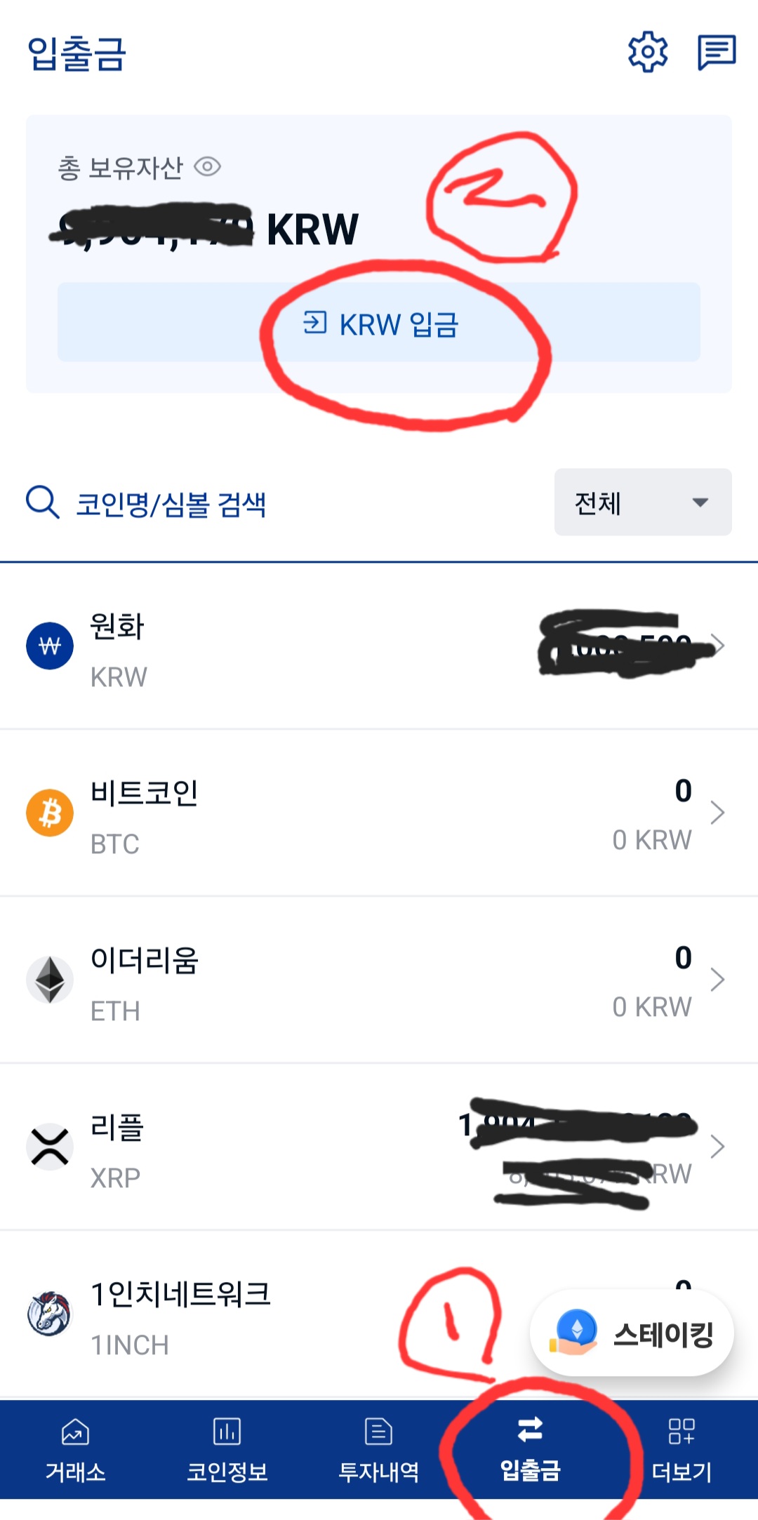 1) 하단 메뉴에서 "입출금" 선택