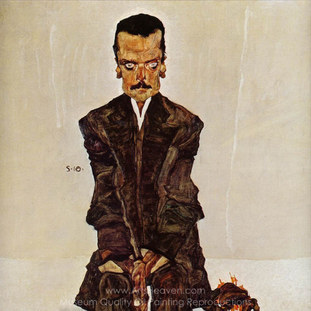 그의 작품 <에두아르트 코스마크>는 당시 문예 출판업자였던 에두아르트 코스마크를 모델로 한 초상화다. 이 그림에서 실레는 인물의 내면을 강조하기 위해 신체를 뒤틀리고 과장되게 표현했으며, 강한 윤곽선과 색감으로 불안한 분위기를 연출했다. 코스마크의 초조한 표정과 움츠린 자세는 단순한 외형 묘사를 넘어 심리적 상태까지 전달한다.