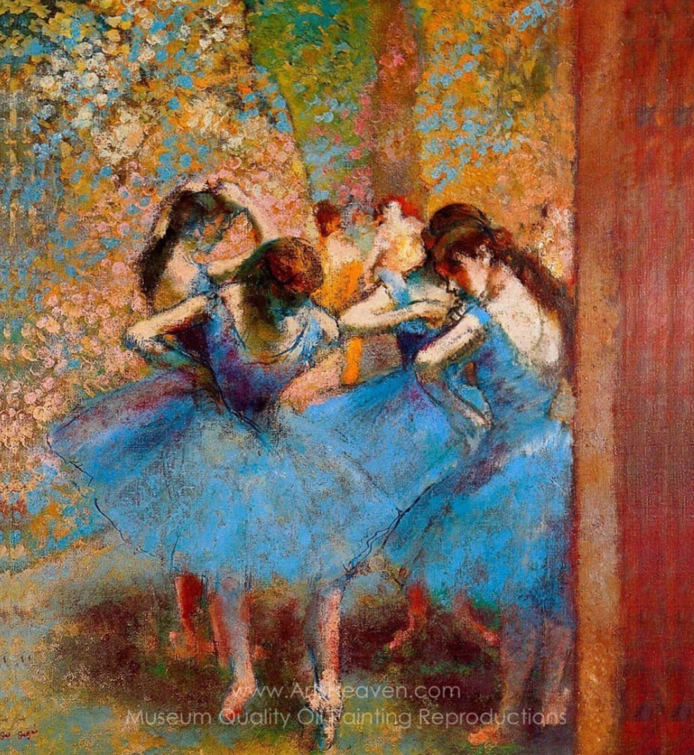 드가는 말년에 시력이 급격히 나빠지면서 파스텔이라는 매체에 집중하게 되었고, 점점 작품은 형태가 흐릿하고 모호한 방향으로 나아갔다. 하지만 이러한 변화는 오히려 그의 회화 세계를 더욱 상징적이고 상상력 넘치게 만들었다. 그는 ‘무희들의 화가’라는 평에 대해 “무희는 단지 아름다운 천을 그리기 위한 구실일 뿐”이라고 말했지만, 그의 작품은 무희들의 삶과 그 이면의 현실, 그리고 예술과 노동의 경계를 섬세하게 포착하고 있다. 특히 무희들의 고된 연습과 무대 뒤의 모습은 당대 관객들의 화려한 삶과 대비되며, 드가 특유의 사회적 통찰력을 드러낸다. <푸른 의상의 무희들>은 단순한 미적 즐거움을 넘어, 인간의 몸과 노동, 예술의 본질에 대한 깊은 성찰을 담고 있는 대표적인 작품이다.
