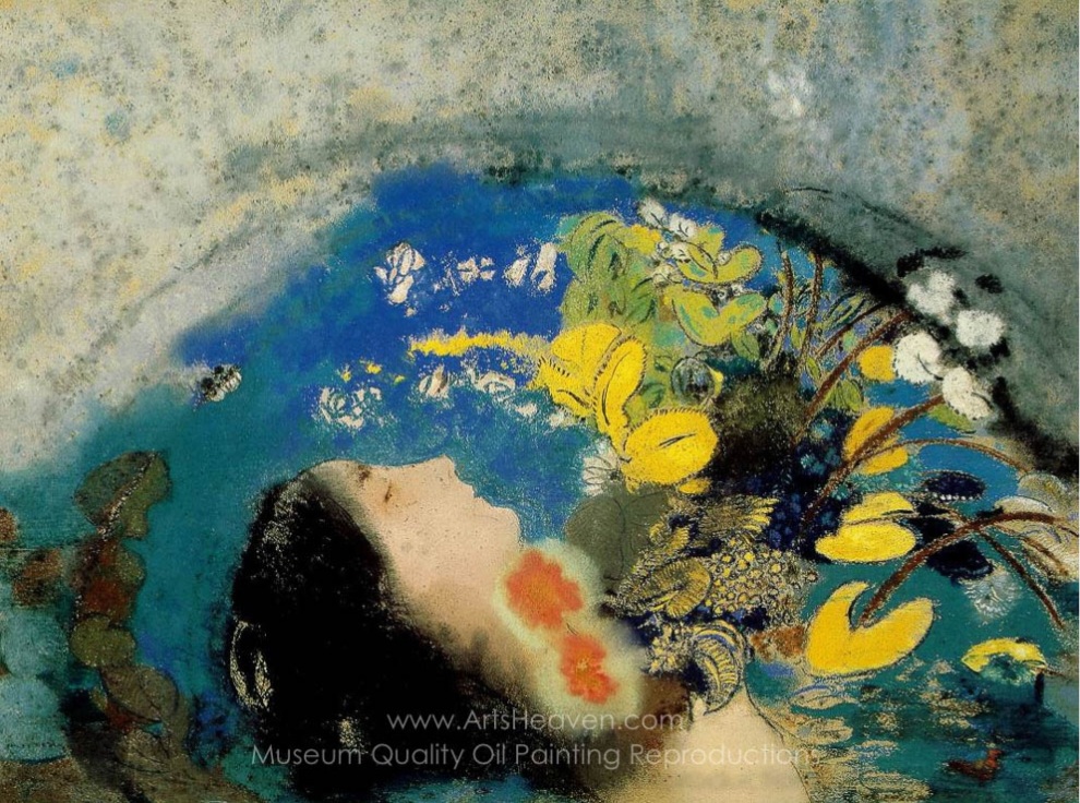 르동의 작품 <오필리어>는 셰익스피어의 희곡 『햄릿』 속 비극적인 여성 인물인 오필리어의 죽음을 주제로 하고 있다. 이 그림은 물에 떠 있는 오필리어의 모습을 중심으로 구성되며, 그녀의 얼굴과 머리카락, 주변에 흩어진 꽃들이 화려하면서도 비현실적인 색채로 표현된다. 특히 강렬한 노란색과 푸른색이 어우러져 오필리어의 죽음을 단순한 비극이 아니라 신비롭고 아름다운 순간으로 승화시킨다. 르동은 이 장면을 사실적으로 그리지 않고, 오필리어의 내면과 감정, 죽음을 둘러싼 상징적 세계를 색채와 형태로 시각화하였다. 따라서 이 작품은 오필리어의 육체적 죽음보다는 그녀의 감정과 영혼의 상태를 전달하고자 한다.