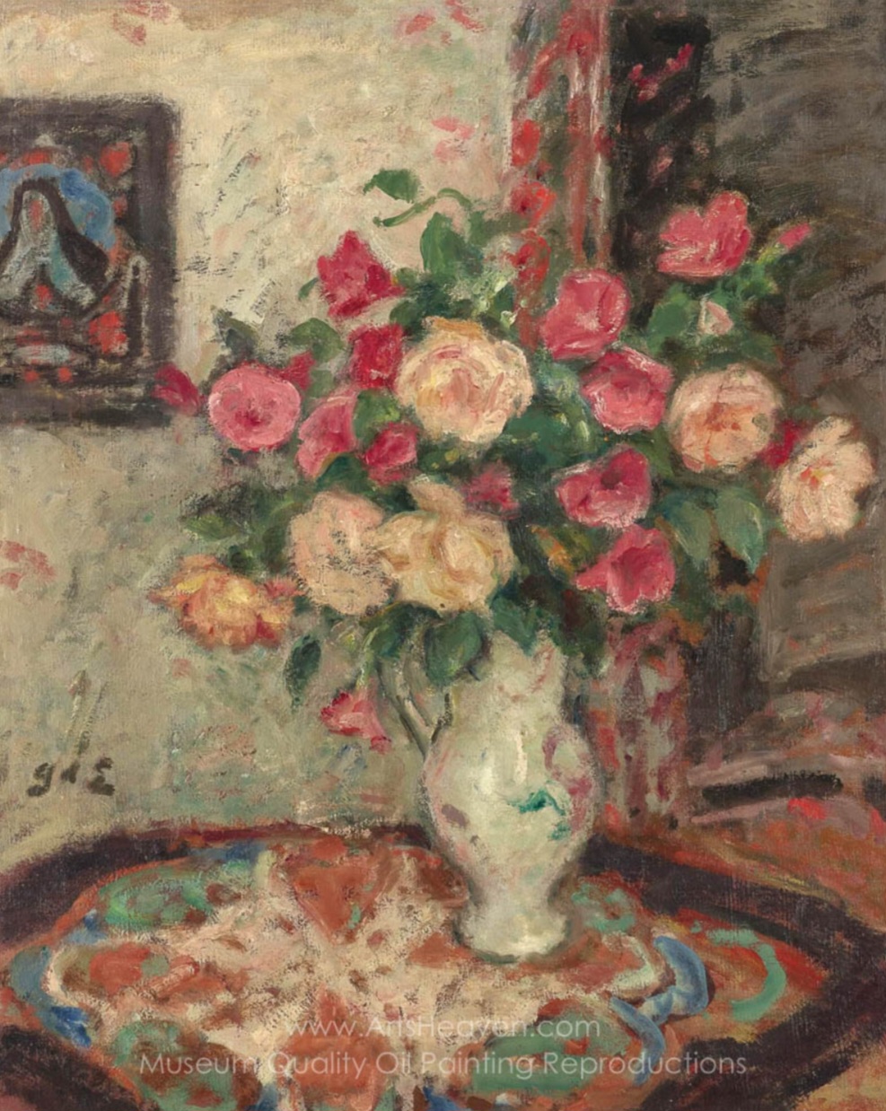 그의 작품 중 하나인 <꽃다발(Bouquet de Fleurs)>는 화병에 꽂힌 화려한 꽃다발을 중심으로 구성된 정물화이다. 이 그림은 장미로 보이는 다양한 색상의 꽃들이 풍성하게 담겨 있으며, 화병은 원형 테이블 위에 놓여 있다. 배경은 실내 장식과 커튼, 그림 액자 등이 어우러져 따뜻하고 고즈넉한 분위기를 자아낸다. 부드러운 붓질과 색채의 농담을 통해 꽃의 생동감과 실내 공간의 아늑함이 조화롭게 표현되었으며, 작가 특유의 감성적 터치가 잘 드러난다. 특히 꽃잎 하나하나의 질감을 섬세하게 표현하면서도 전체적인 조화는 흐트러지지 않도록 유지하고 있어, 보는 이로 하여금 시각적인 안정감과 따뜻함을 동시에 느끼게 한다.