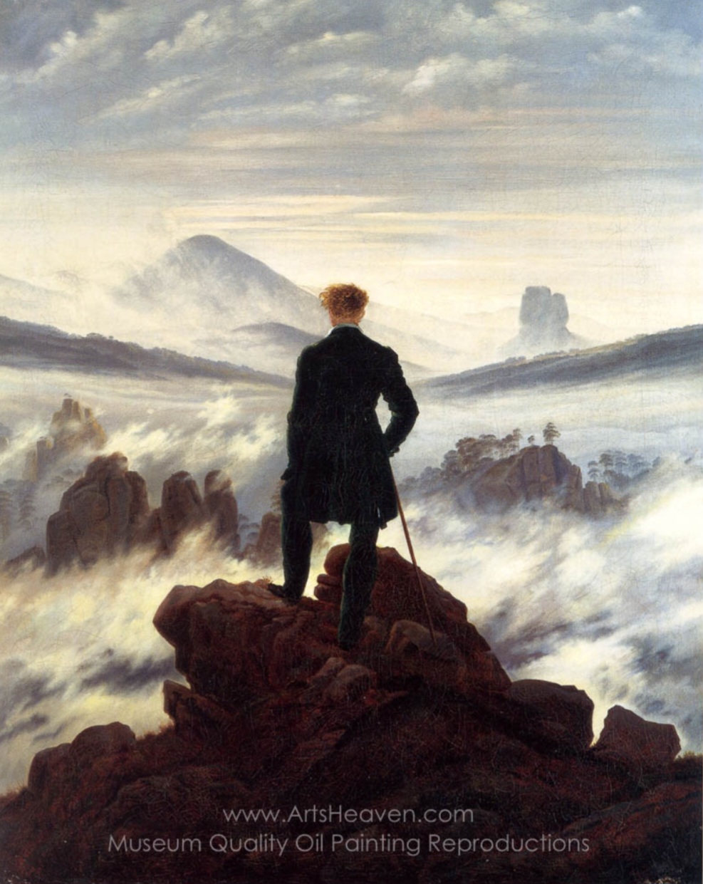 프리드리히의 <안개바다 위의 방랑자>는 19세기 초 독일 낭만주의 정신을 강렬하게 반영한 작품이다. 이 그림은 전형적인 낭만주의적 인간상을 묘사하며, 인간의 고독, 자연의 신비로운 상징성, 그리고 필멸성을 마주하는 경험을 형상화했다. 프리드리히는 회화를 통해 낭만주의적 정서를 해석한 대표적 화가로, “화가는 눈앞에 보이는 것뿐만 아니라 내면에서 보는 것도 그려야 한다”는 신념을 바탕으로 자연을 인간의 감정을 투영하는 거울로 활용했다.