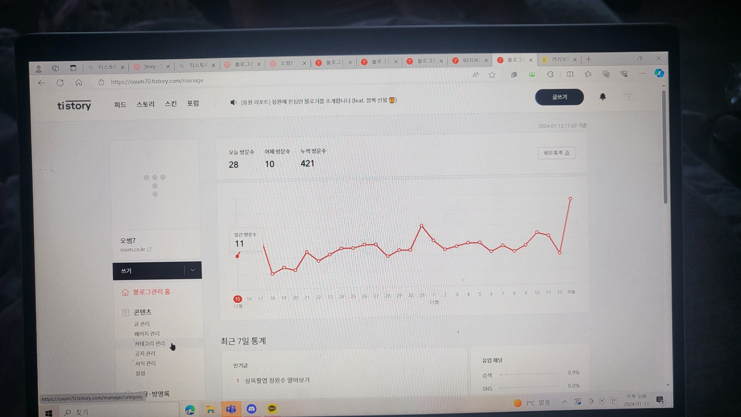 티스토리에 글을 20개 작성하고 애드센스 신청하기 전, 컴퓨터가 없어 카테고리 설정을 하지 못했는데 창원에 와서 딸 노트북으로 카테고리를 설정하고 작성했던 글에 해당 카테고리 지정을 완료했다.