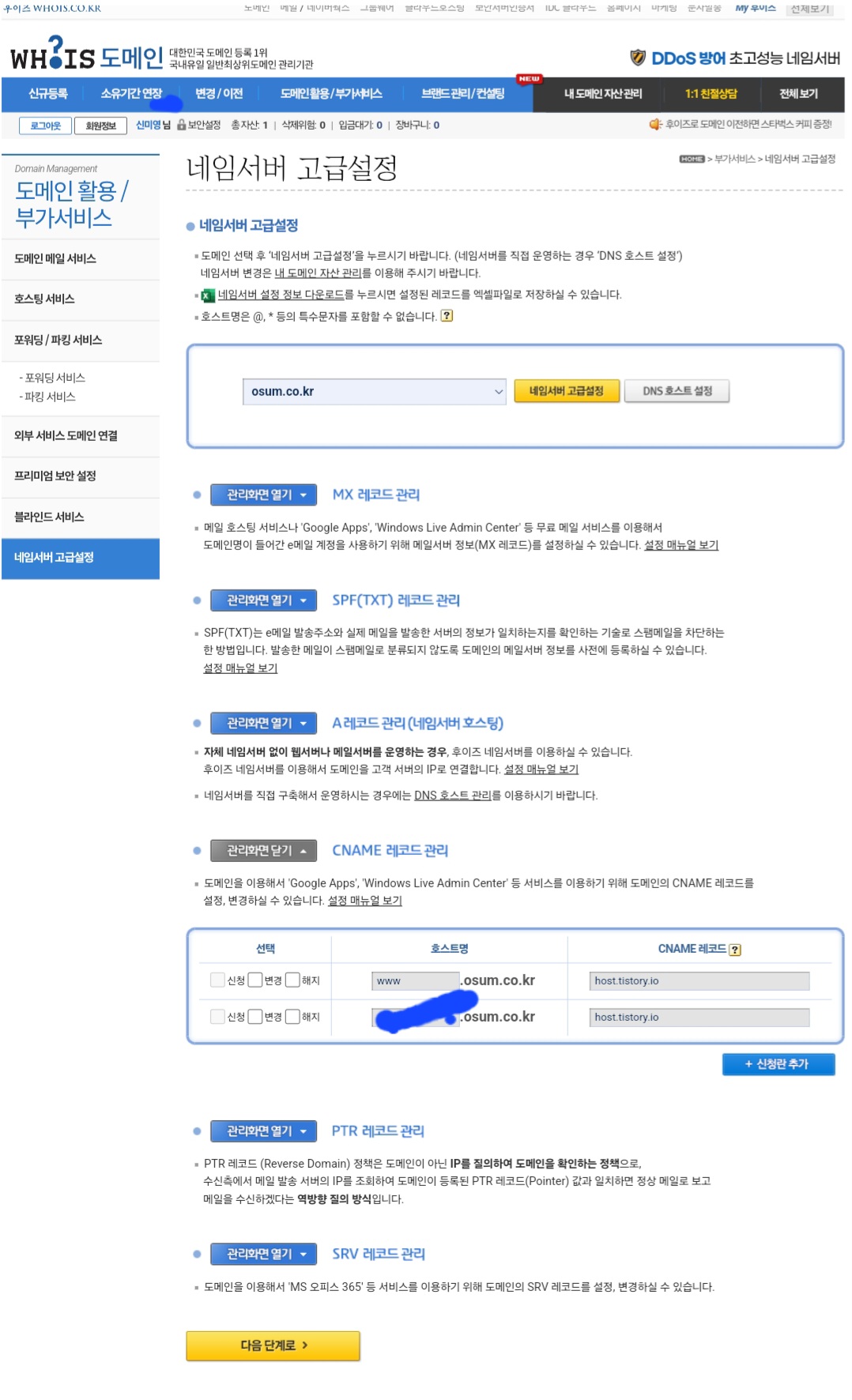*네임서버 고급설정 바로 가기 -> https://domain.whois.co.kr/ns_service/service.php