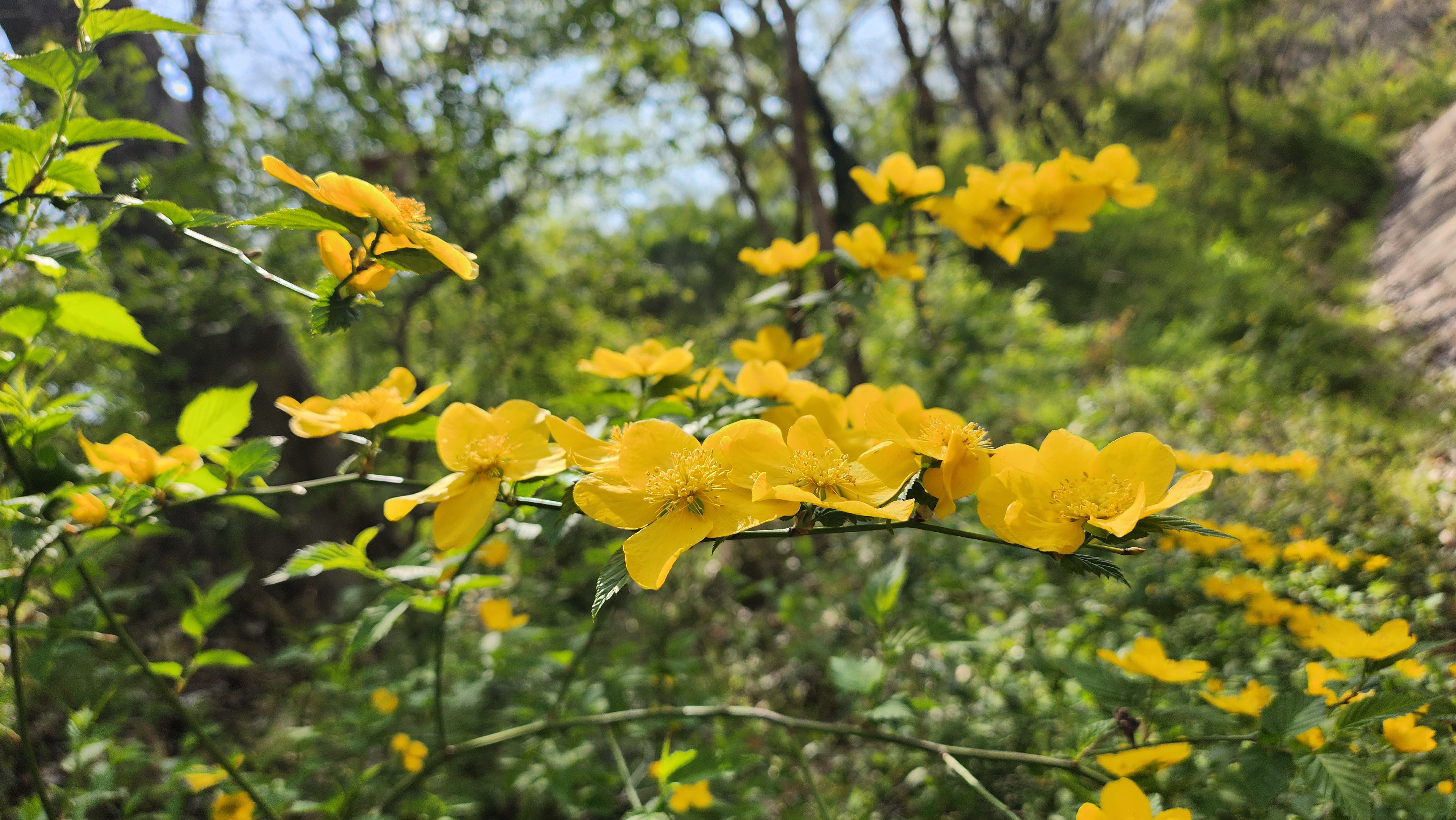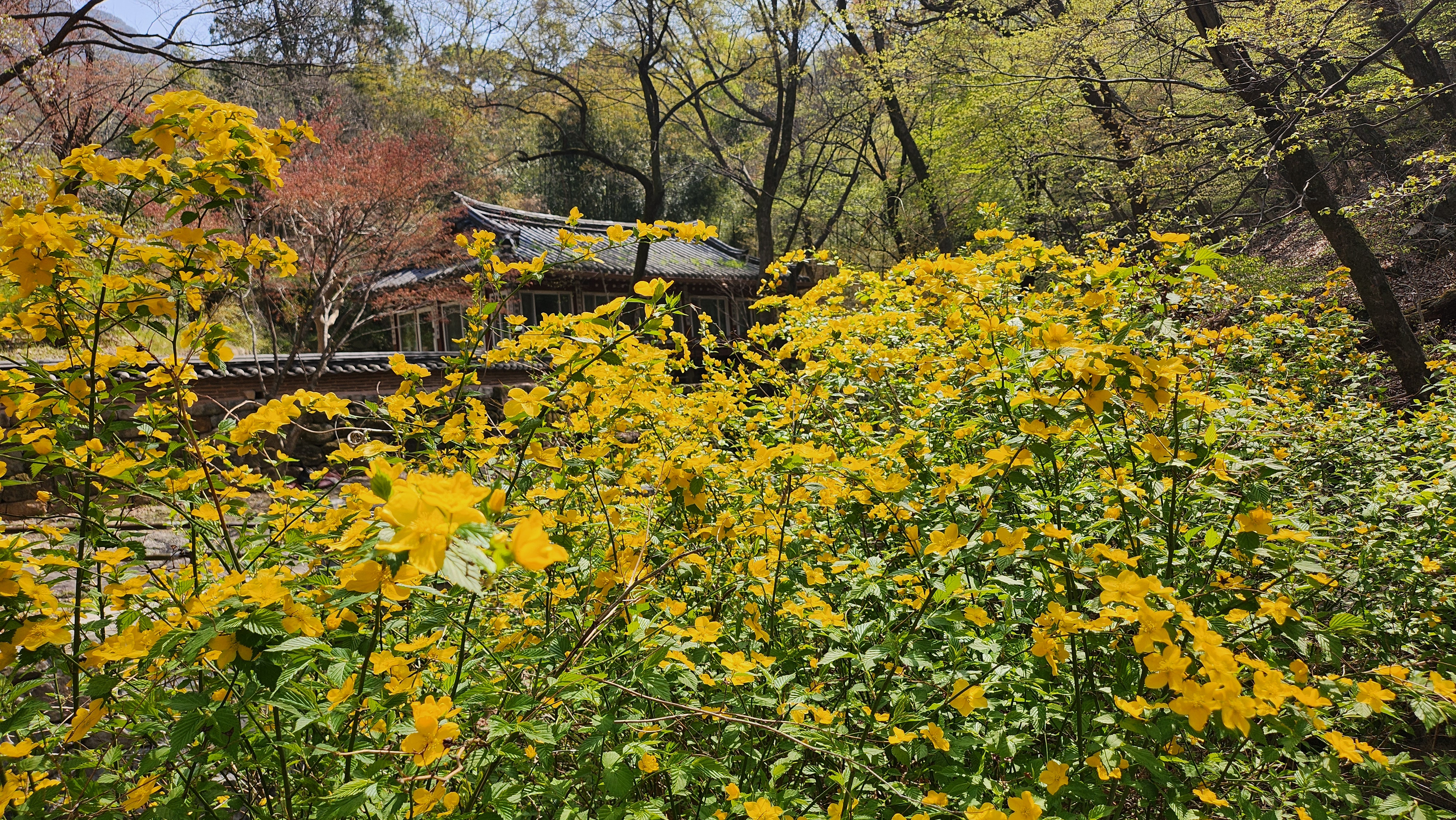 황매화는 장미과의 낙엽관목으로, 보통 4월 중순에 노란 꽃을 피워 봄의 절정을 알린다. 꽃은 5장의 단순한 꽃잎으로 이루어진 단화(單花) 형태로, 청초하고 소박한 아름다움을 지닌 것이 특징이다. 국내에서는 야생으로 자라거나 산사 주변, 정원 등에 자주 식재되며, 자연 그대로의 분위기와 잘 어울린다. 갑사 일대는 황매화가 대규모로 자생하는 보기 드문 장소로, 산사의 고건축과 어우러질 때 그 정취가 더욱 깊어진다. 생육이 왕성하고 병충해에도 강해 관리가 용이하며, 매년 꽃이 절정을 이루는 시기에는 많은 관광객들이 이 꽃을 보기 위해 갑사를 찾는다.