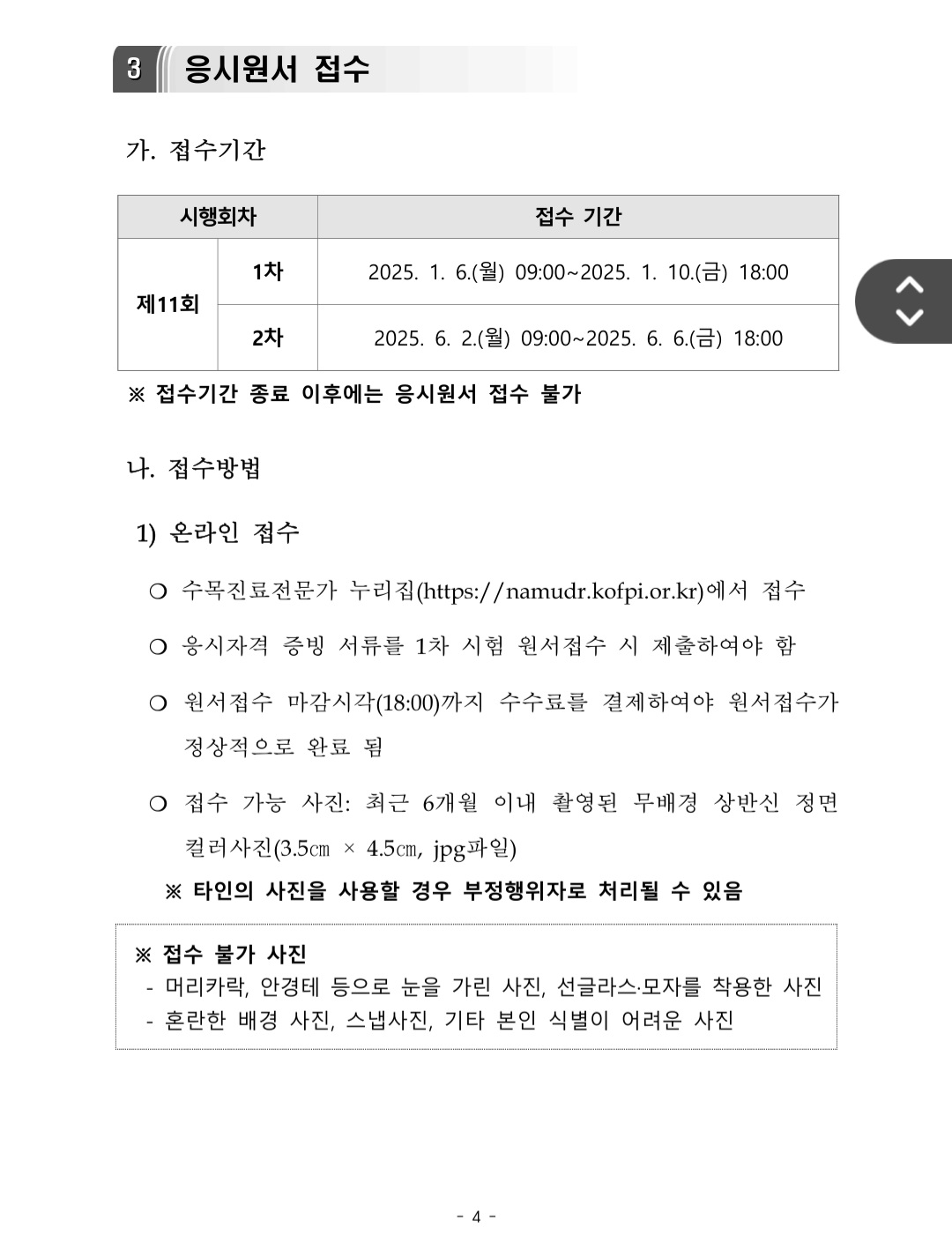 2025년 나무의사 자격시험(제11회) 시험계획에 따르면, 1차 시험 원서접수는 2025년 1월 6일(월) 오전 9시부터 1월 10일(금) 오후 6시까지 실시했고, 시험일은 2월 22일(토)이다. 1차 시험의 합격자는 4월 18일(금) 오후 6시에 발표한다.