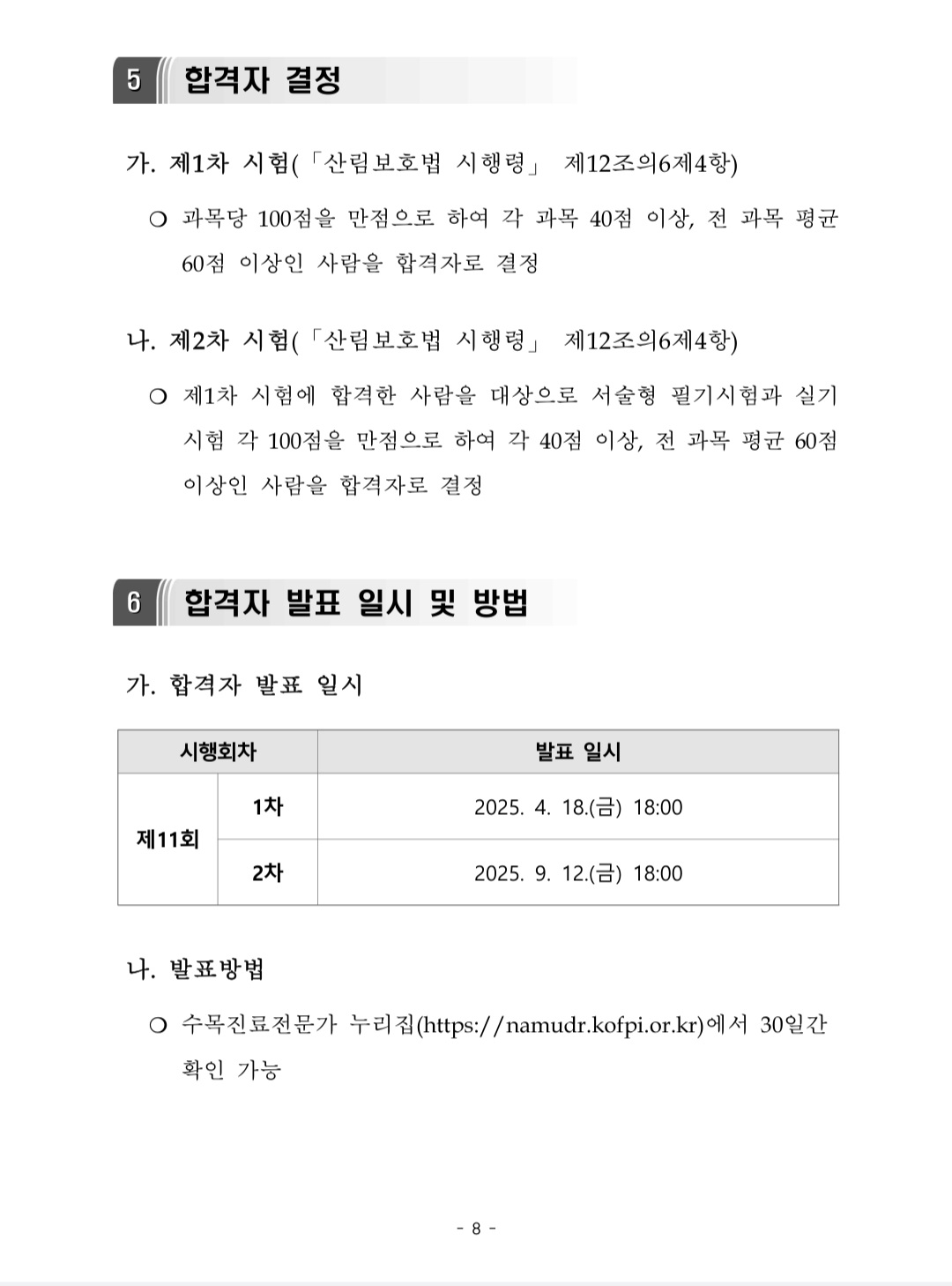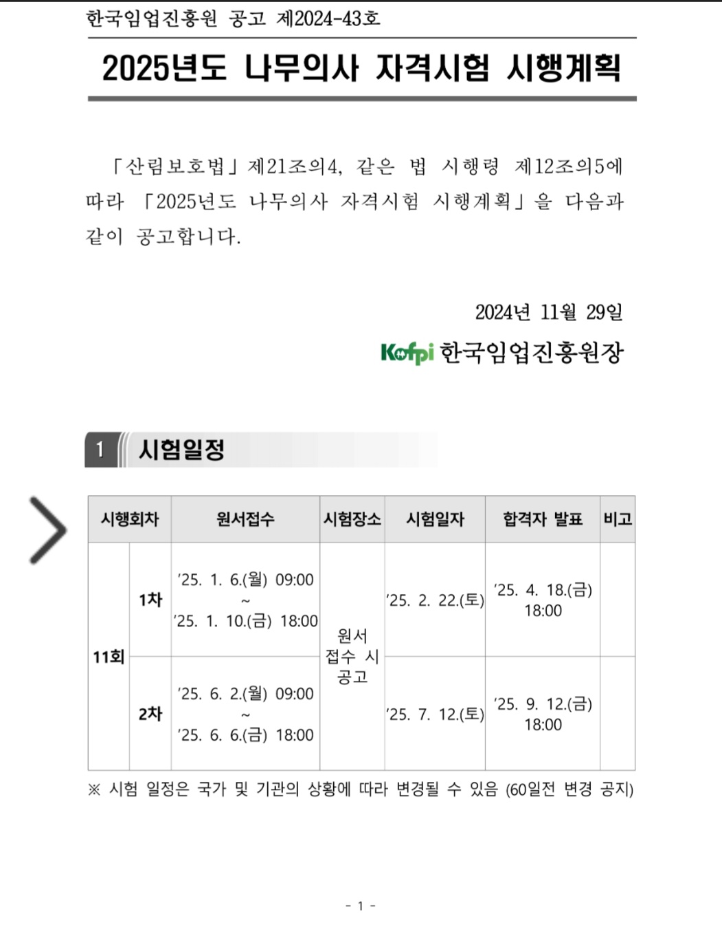2025년 나무의사 자격시험(제11회) 시험계획에 따르면, 1차 시험 원서접수는 2025년 1월 6일(월) 오전 9시부터 1월 10일(금) 오후 6시까지 실시했고, 시험일은 2월 22일(토)이다. 1차 시험의 합격자는 4월 18일(금) 오후 6시에 발표한다.